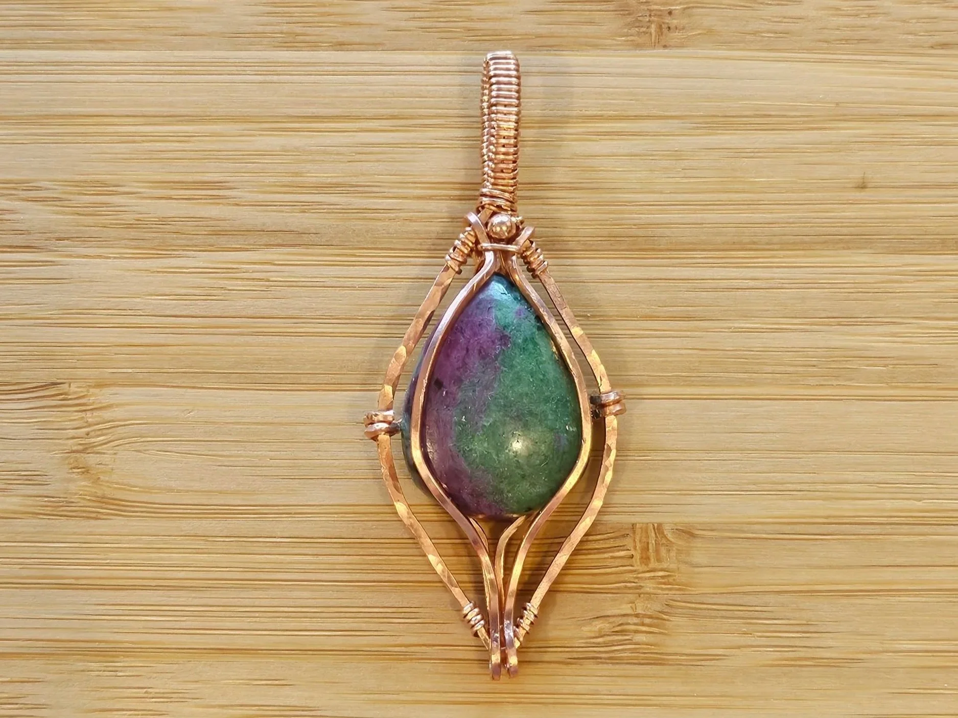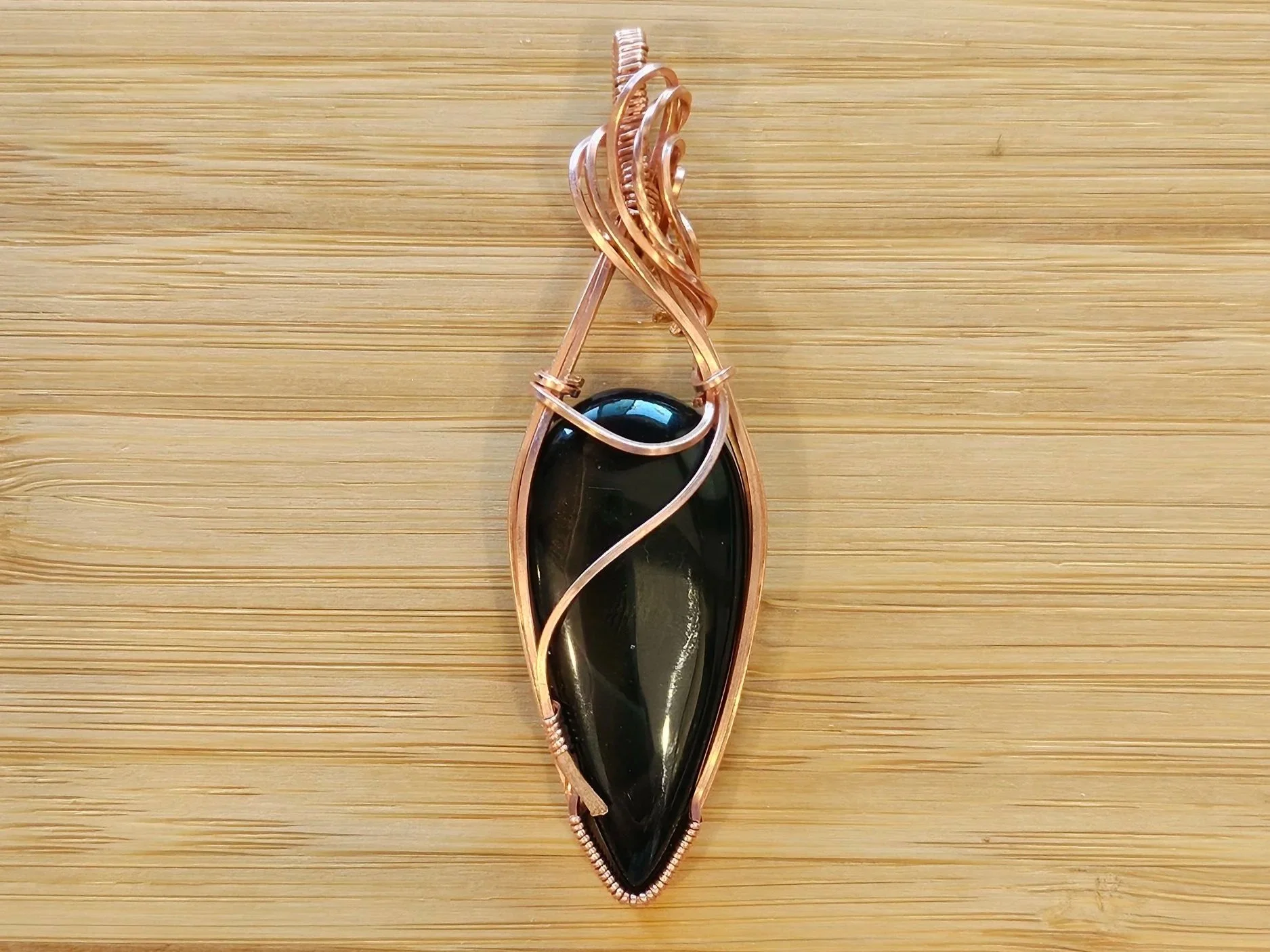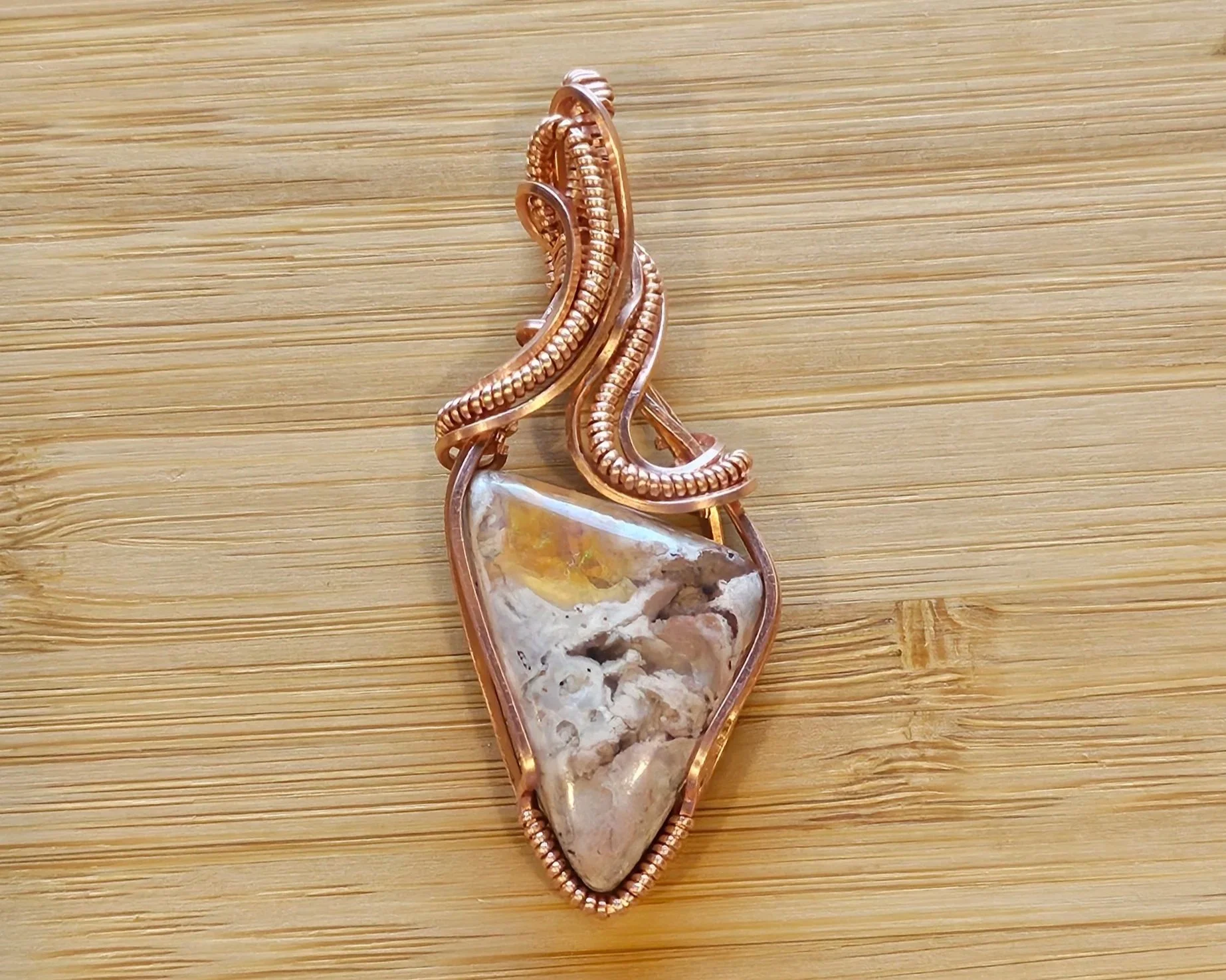 WIP: Mexican Fire Opal, wrapped in pure copper. Will be sanded, oxidized, and polished when I get home.