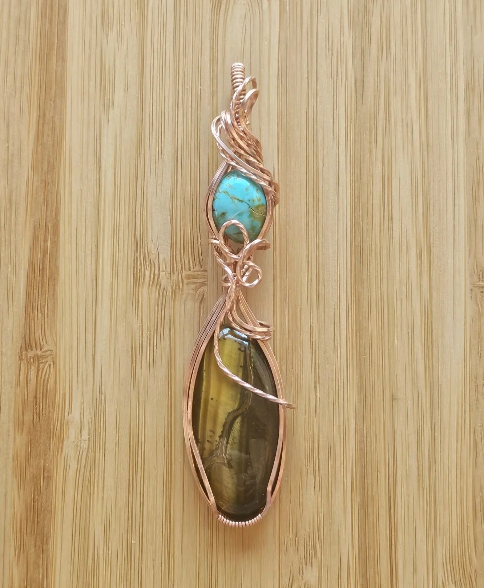 WIP: I have been playing with some “doubles.” I like this one. It is a combination of tiger’s eye and turquoise. It will be great to see it oxidized and polished.